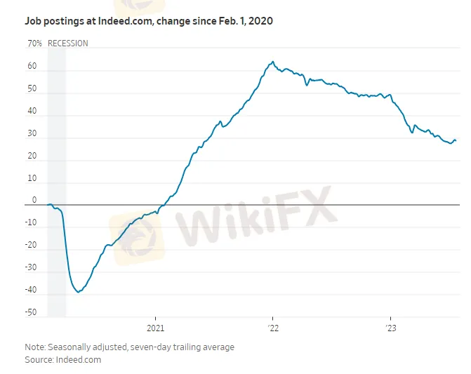 Indeed最近公布的私营部门数据也显示,劳动力需求正在稳步放缓。7月中旬,招聘网站上的职位总数比去年同期下降了16%,但仍高于疫情前的水平。