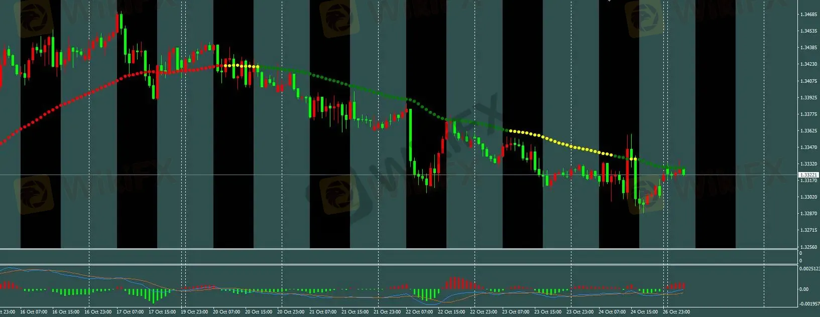 三色线策略:绿色持空,H1空单1.3416已盈利。今日用M5模型短线交易。