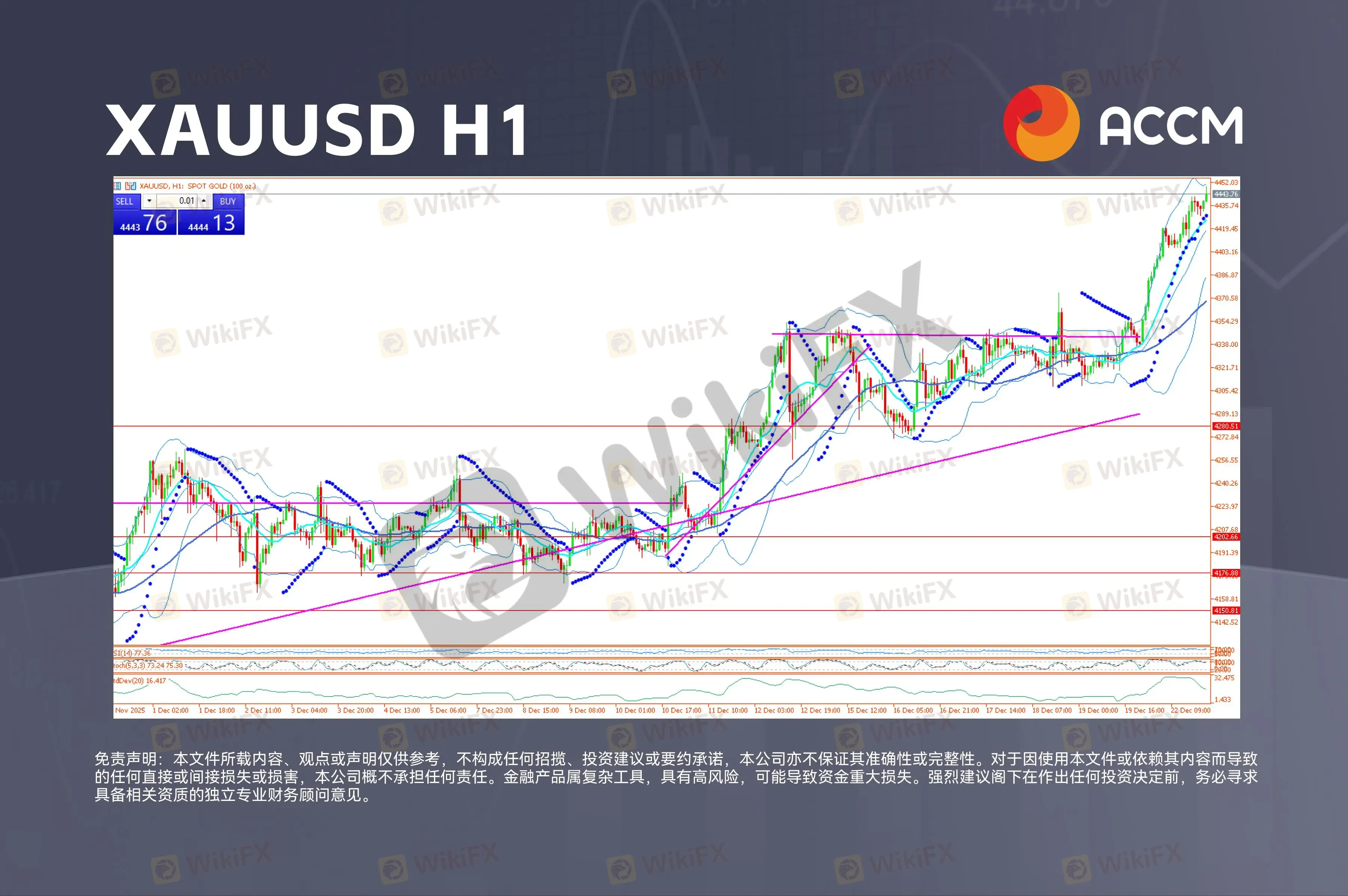 摘要:周一,美国股市收盘上涨,在假期前仅剩的两天半交易时间里,市场对“圣诞行情”的期待再度升温。与此同时,贵金属继续成为今年“不断送礼”的资产,黄金与白银双双刷新历史纪录。今年以来,黄金价格累计上涨近70%,主要受美联储降息推动,同时也受到各国央行大规模买入、动量型资金追涨,以及全球不确定性背景下避险需求的共同支撑。XAUUSD H1周一,现货黄金价格大涨2.4%,报每盎司4,442美元,历史上首次突破