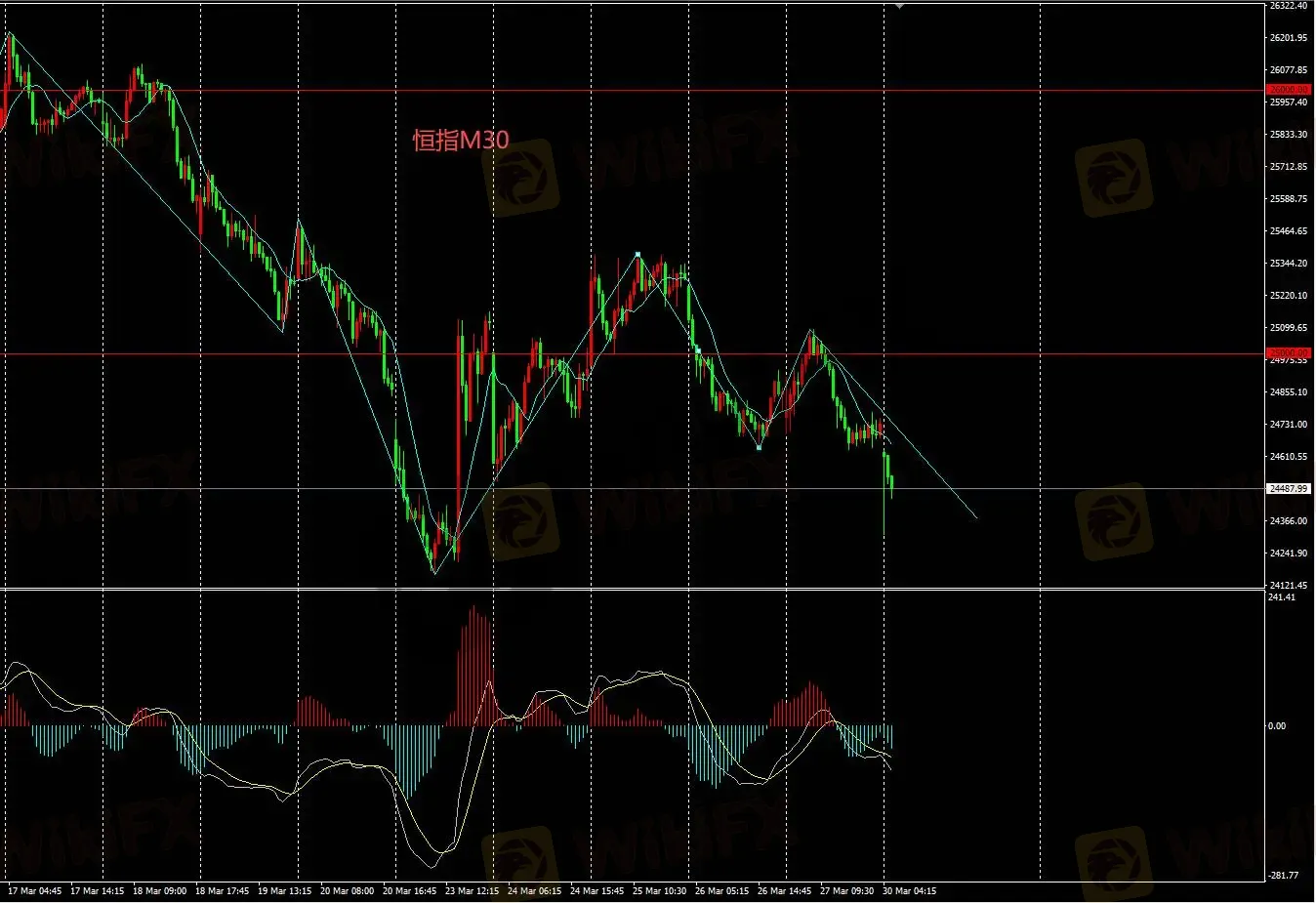 恒指M30持续看空,日内逢高卖出操作,上方重要关口25000,目标24000。