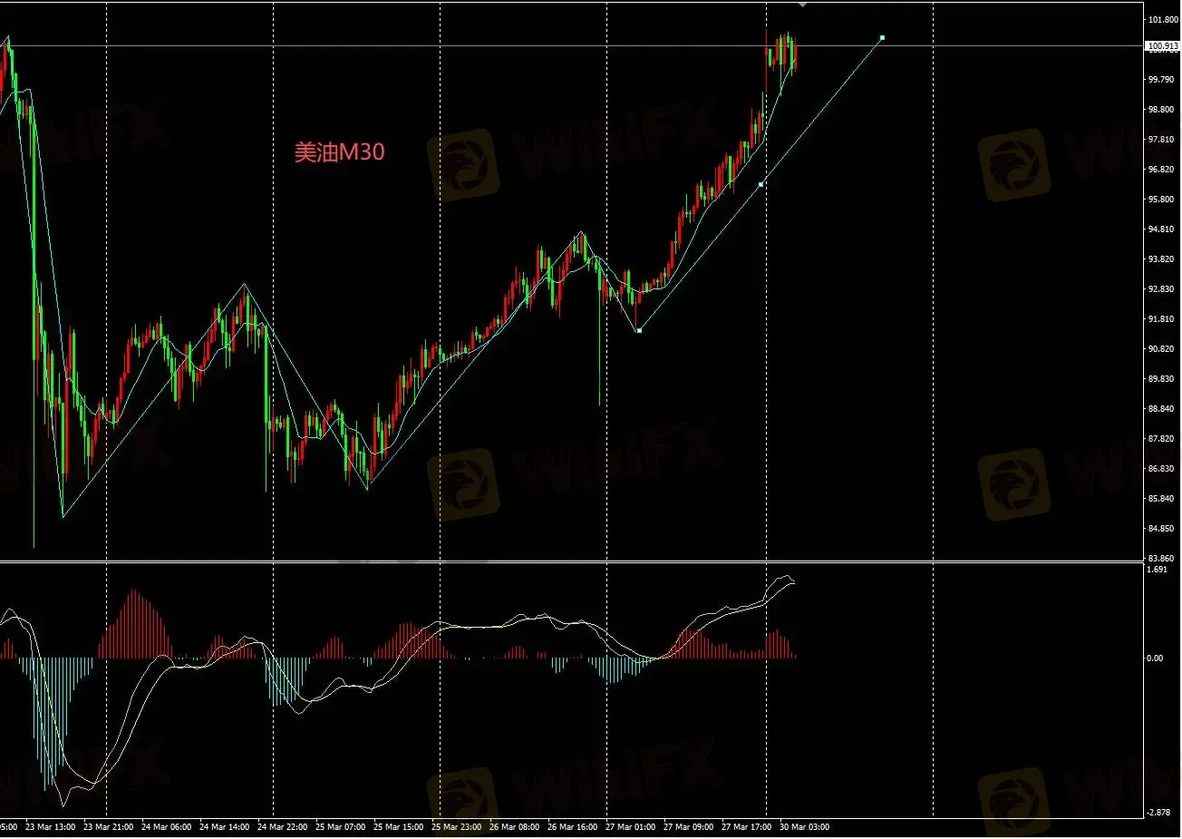 美油M30图表多头宜等待震荡下跌结束后,逢低买入操作;但需知该品种波动较大,当前市场神经敏感。