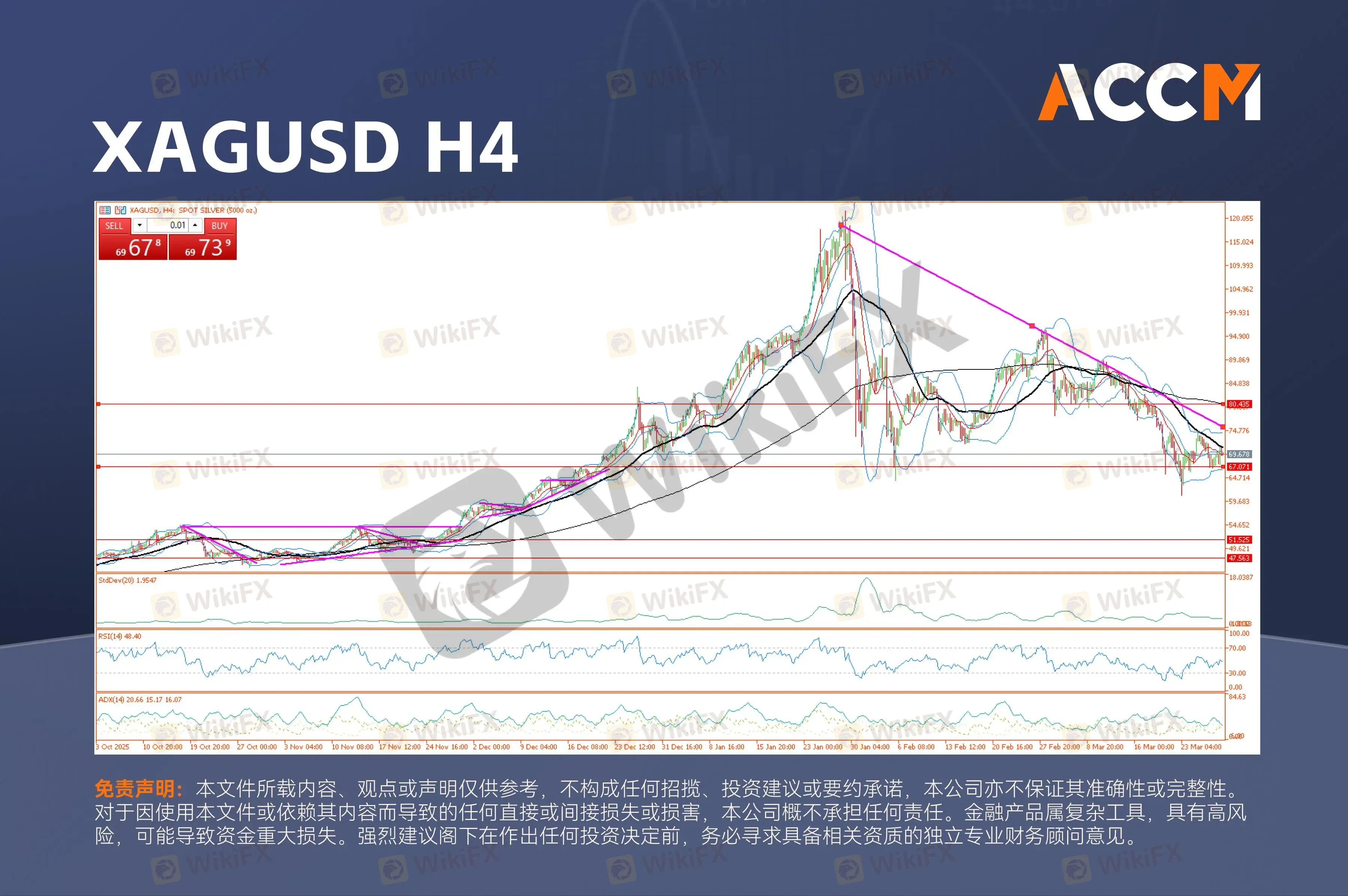 白银当前正处于结构性脆弱阶段,其特征为剧烈的冲击式下跌后,尝试构筑一个不稳定的技术底部。在3月18日触及79.891的高点后,市场经历了一轮流动性冲击,价格在3月23日迅速下探至62.875的低点。在不到一周时间内完成约21%的回调,凸显出白银市场中普遍存在的高杠杆特性,以及机构资金在避险过程中快速轮动的能力。目前白银报69.909,正处于下降楔形的顶端区域,多空双方围绕70.000这一关键心理关口展开激烈博弈。