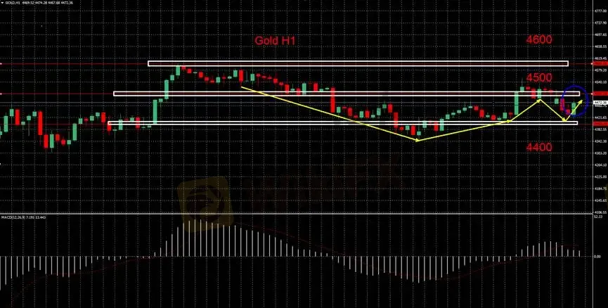 目前結構屬於區間震盪偏弱,價格在4400–4500之間來回測試,但多次上攻4500未能有效站穩,顯示上方壓力仍然明確。