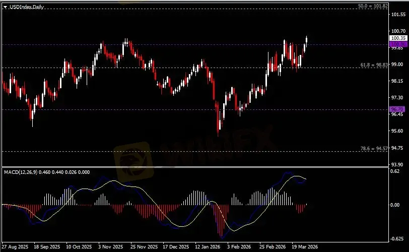 日线图显示美元指数震荡上行,当前收于前高100。从MACD来看,快慢线形成金叉,红色动能柱收缩殆尽。指数走势基本和动能柱的变化一致。