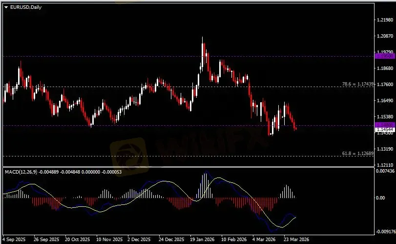 日线图显示欧元兑美元震荡走弱,当前略收于前低1.1480。从MACD来看,快慢线欲形成死叉,白色动能柱收缩殆尽。汇价走势基本和动能柱的变化一致。