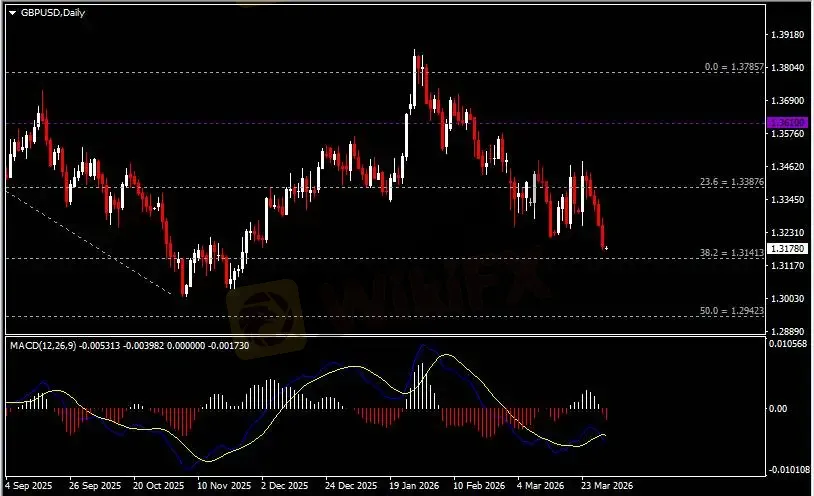 日线图显示英镑兑美元震荡下挫,当前逼近1.3140支撑。从MACD来看,快慢线死叉依旧,红色动能柱温和放量。汇价走势基本和动能柱的变化一致。