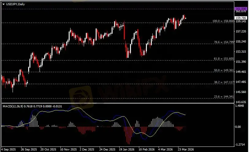 日线图显示美元兑日元高位回调,当前仍收于158.90支撑。从MACD来看,快慢线金叉依旧,红色动能柱温和收缩。汇价走势和动能柱的变化呈分歧。