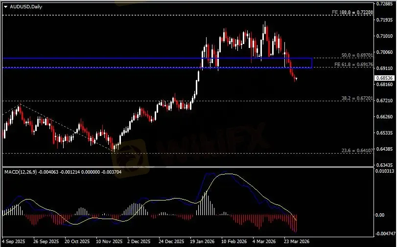 日线图显示澳元兑美元震荡下跌,当前承压于0.6920-0.6970阻力区域。从MACD来看,快慢线向下运行,红色动能柱温和放量。汇价走势基本和动能柱的变化一致。