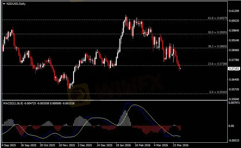 日线图显示纽元兑美元震荡走弱,当前收于前低0.5740。从MACD来看,快慢线向下扩张,红色动能柱温和放量。汇价走势基本和动能柱的变化一致。