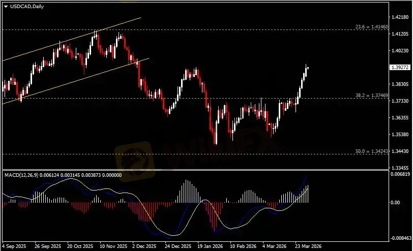 日线图显示美元兑加元震荡上行,当前企稳于1.3750支撑。从MACD来看,快慢线向上运行,白色动能柱温和放量。汇价走势基本和动能柱的变化一致。