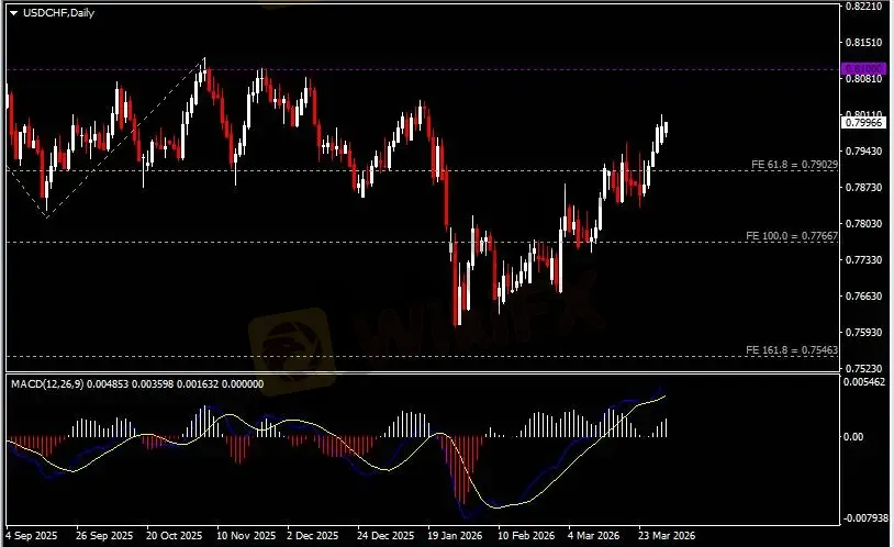 日线图显示美元兑瑞郎震荡上行,当前企稳于0.79关键支撑。从MACD来看,快慢线拐向上行,白色动能柱温和放量。汇价走势基本和动能柱的变化一致。
