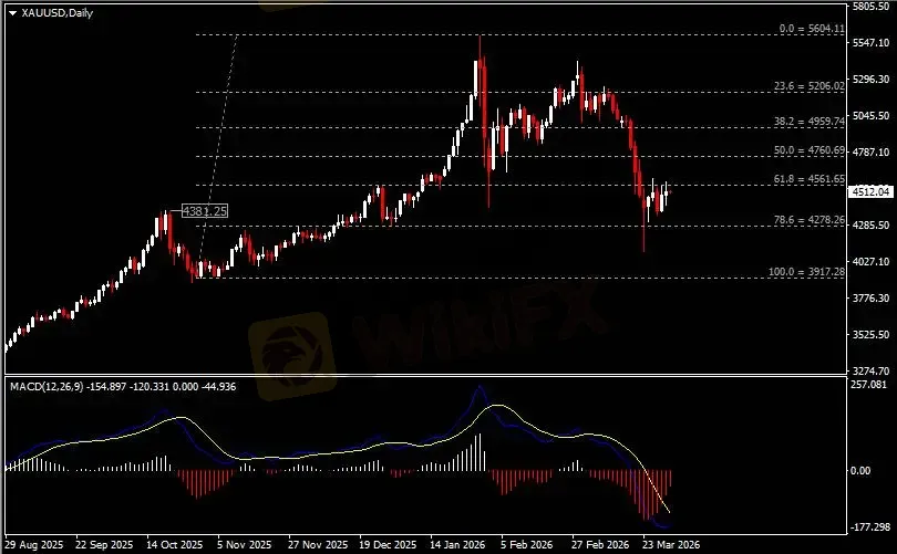 日线图显示金价反弹收涨,当前测试4560阻力。从MACD来看,快慢线呈拐向,红色动能柱温和收缩。金价走势基本和动能柱的变化一致。