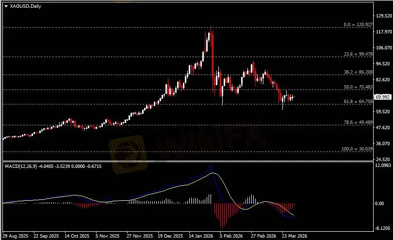 日线图显示银价持稳于64.80支撑。从MACD来看,快慢线呈拐向,红色动能柱温和收缩。银价走势和动能柱的变化稍呈分歧。