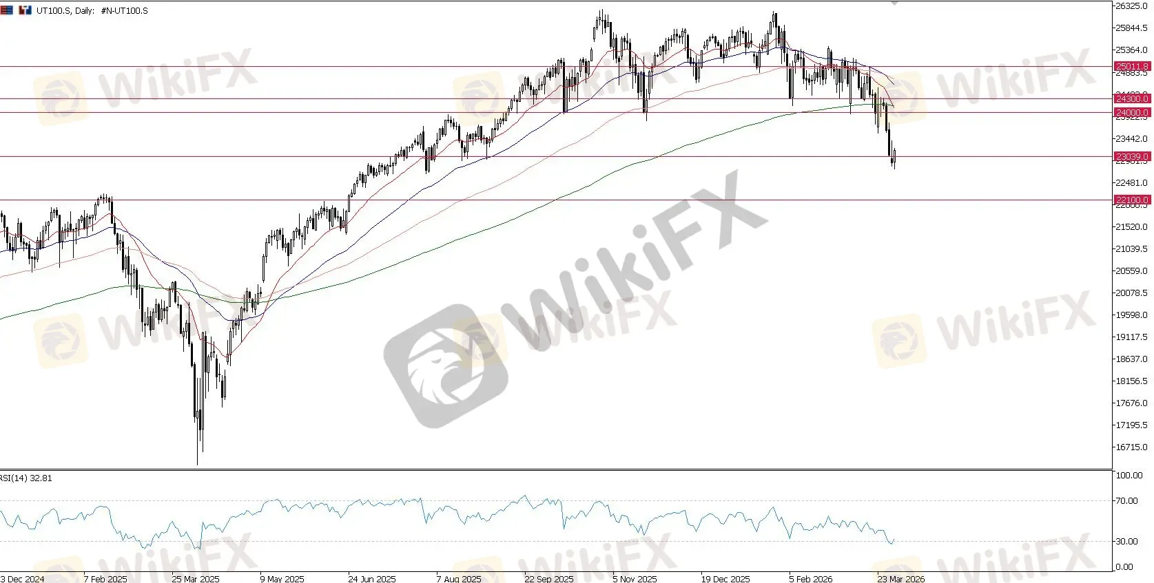 技术面上,纳斯达克 100 指数已跌至 23,000 的 支撑位。虽然预计会出现技术性反弹,但果断跌破 200 日移动平均线以及多条 EMA 形成的看跌交叉证实了 该指数已深陷熊市区域。 因此,任何反弹依然严重偏向 下行。