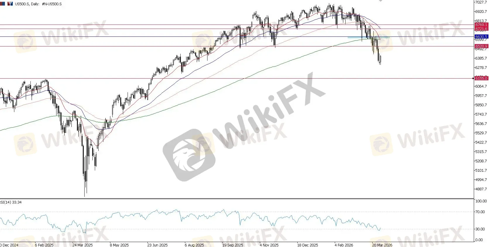 标普 500 指数同样如此;广泛的看跌 结构依然完全有效。特别是在结构性跌破 6,500 关口之后,下一个主要的下行支撑目标可能会看向 6,155 水平。