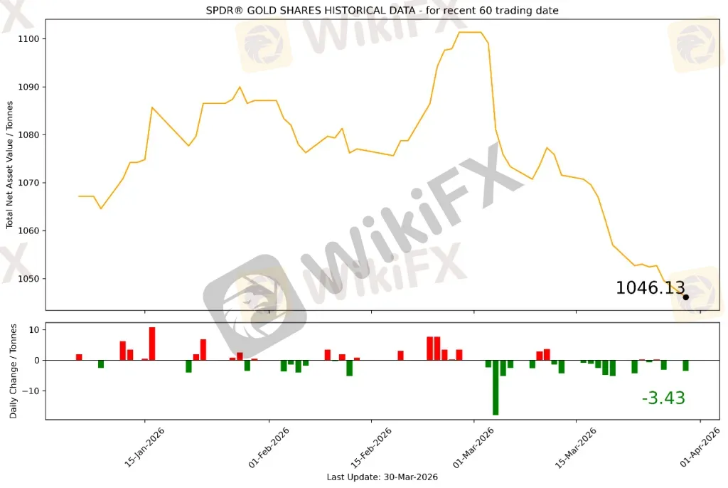 截至2026年03月30日,全球最大的黄金ETF SPDR Gold Trust持仓量为1046.13吨,较上一个交易日减少3.43吨。2026年03月30日现货黄金自4480.76美元/盎司开盘后短暂上冲4510美元一线随后暴跌90美元至当日低点4419.54美元/盎司,随后陆续收回跌幅并站稳4500美元。盘中一度上冲至4580.55美元/盎司,美盘交易期间震荡回落,最终收于4510.46美元/盎司,涨29.7美元或0.66%。