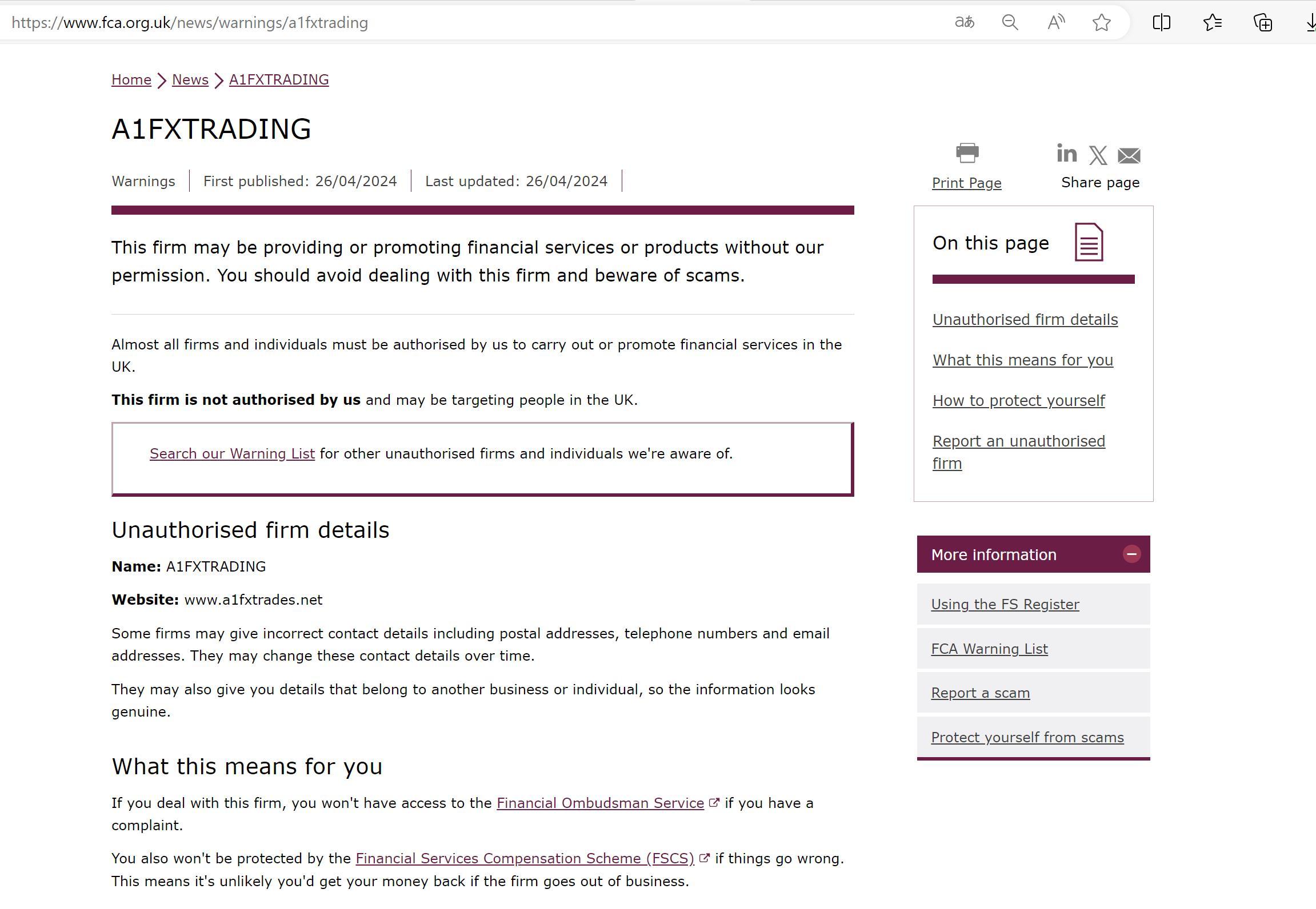 警告 首次发布:2024 年 4 月 26 日 最后更新:2024 年 4 月 26 日 该公司可能在未经我们许可的情况下提供或推广金融服务或产品。您应避免与该公司打交道,并谨防诈骗。几乎所有公司和个人都必须获得我们的授权才能在英国开展或推广金融服务。该公司未获得我们的授权,可能以英国人为目标。在我们的警告列表中搜索我们知道的其他未经授权的公司和个人。 未经授权的公司详细信息 名称:A1FXTRADING 网站:www.a1fxtrades.net 一些公司可能会提供错误的联系方式,包括邮政地址、电话号码和电子邮件地址。他们可能会随着时间的推移更改这些联系方式。他们还可能向您提供属于其他企业或个人的详细信息,因此信息看起来是真实的。